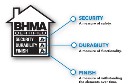 The BHMA lock rating is a residential lock grading system. Its aim is to simplify lock grades so that consumers can better understand them. Unlike the ANSI lock grading system which has very specific use and durability requirements, the BHMA rating gives a simple letter grade to three separate components: Security, Durability, and Finish. The rating system assigns an A, B, or C grade for each component. C is good, B is better, and A is the best. The best BHMA grade then is AAA.
