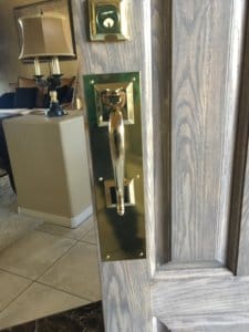 In the photo showing a brass push plate under a handle set, the customer had us replace her old handle set using this method. It’s not as pretty as it may have been with a new door, but a couple of plates installed to cover existing door holes is drastically cheaper than replacing a solid wood door. You can pick up door push plates to fix door holes for around $13 on Amazon.