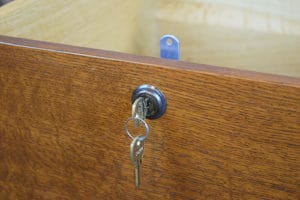 Desk drawer lock options are plentiful. The most common we install are cam locks, deadbolt locks, plunger locks, or a stealth keyless lock (name the stealth because there’s no indication that a lock is on the drawer).